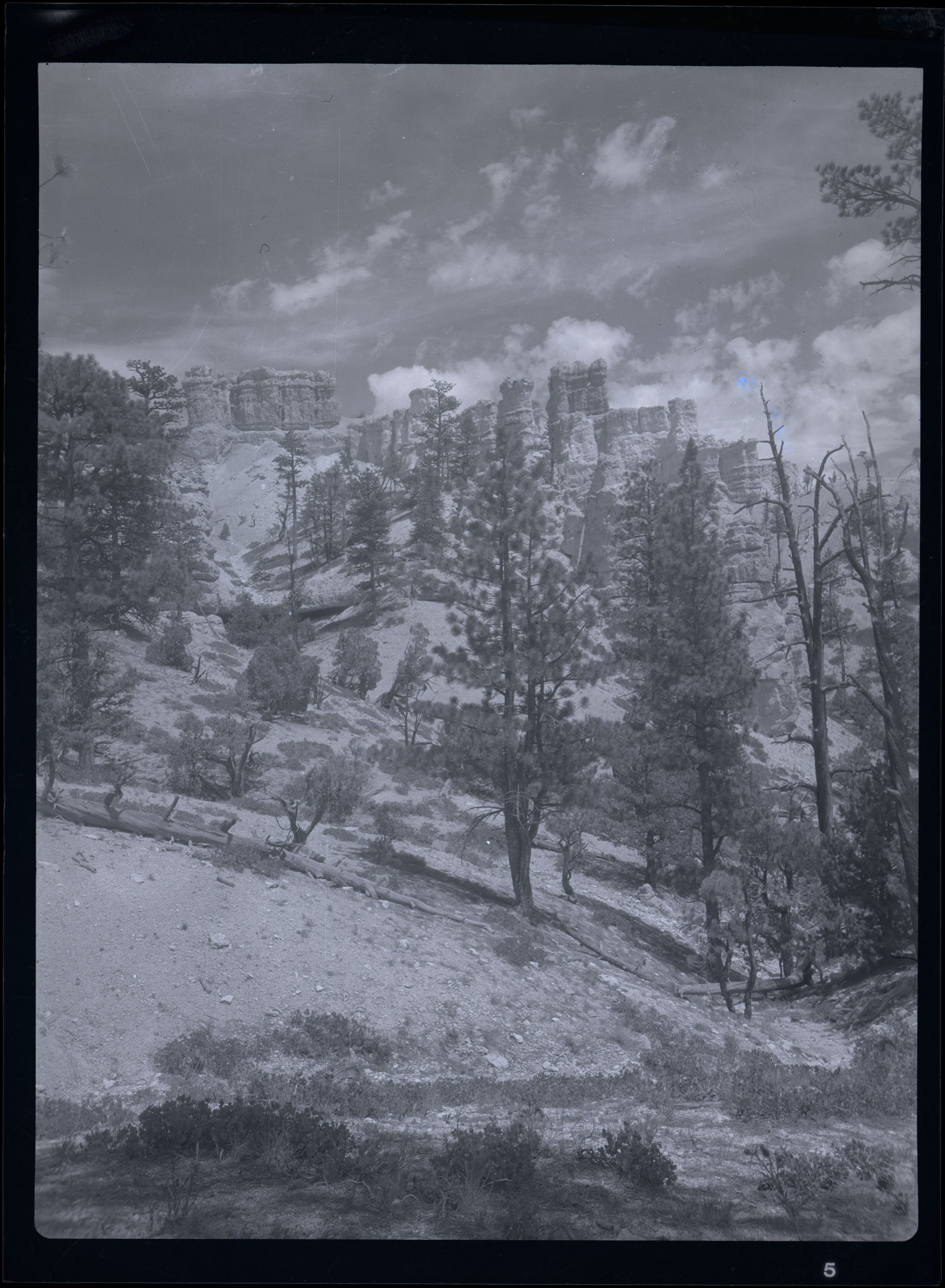 Nitrate negative of hoodoos and trees from the canyon floor in BRCA. ; BRCA Museum and Archives Image BRCA8875_001_319 ; BRCA 8875