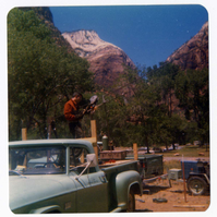 Worker setting up the tramline for the transportation of equipment for the construction of Wiley Tank. ; ZION Museum and Archives Image 005.09.12-6of27 ; ZION 15933