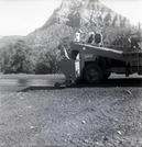 Construction vehicle during chipsealing of Kolob Canyon Road. ; ZION Museum and Archives Image 002.12.06-16of20 ; ZION 15933