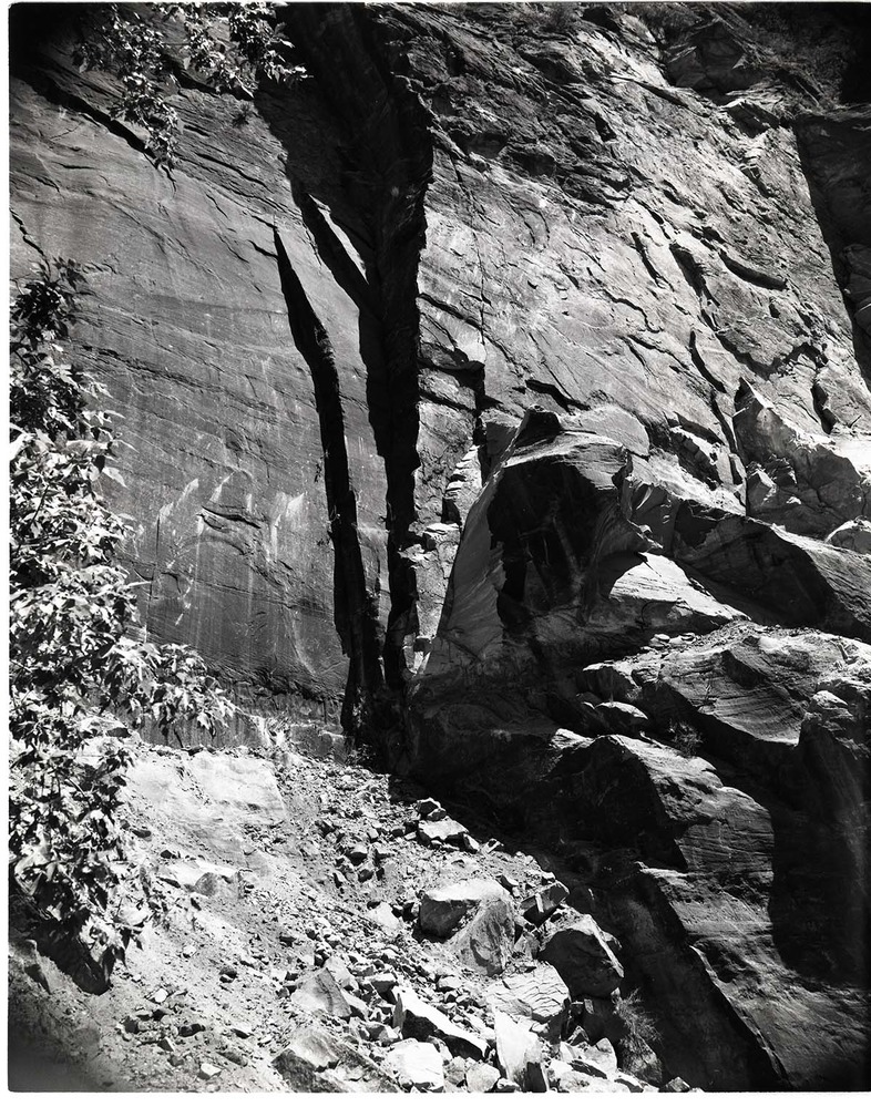BW photo of a rock slide along the Narrows Trail. ; ZION Museum and Archives Image 107_06_09004 ; ZION 15933