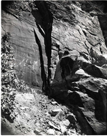 BW photo of a rock slide along the Narrows Trail. ; ZION Museum and Archives Image 107_06_09006 ; ZION 15933