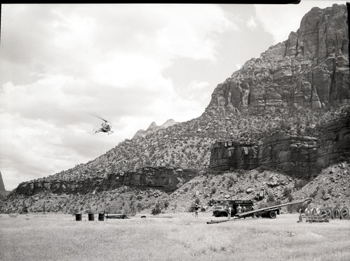 Watchman sewer line crossing arroyo. ; ZION Museum and Archives Image 006_07_002 ; ZION 15933