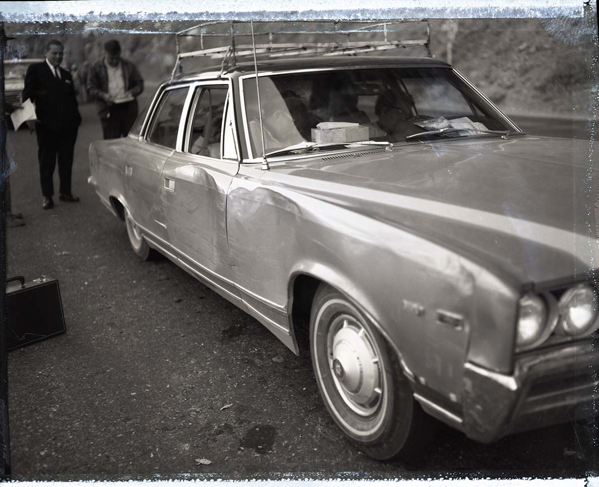 Damage to park vehicle (Chief Ranger's car) after hitting horse. ; ZION Museum and Archives Image 107_05_005 ; ZION 7219