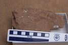 It is a reddish brown, lake deposit rock with semi-rough to rough texture; small white shells and pieces imbedded.