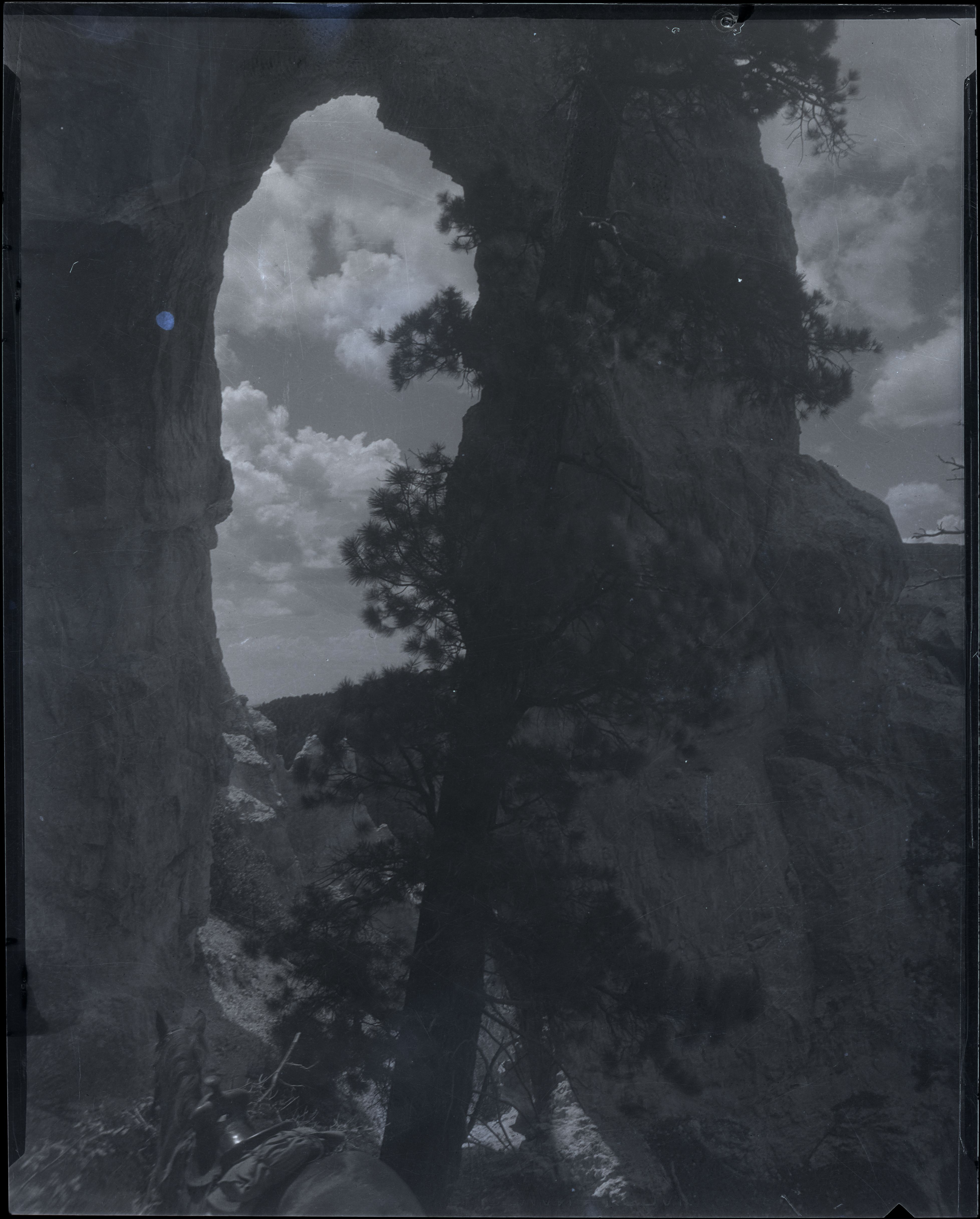 Nitrate negative of saddled horse standing next to Ponderosa pine in front of a large arch in BRCA. ; BRCA Museum and Archives Image BRCA8875_001_115 ; BRCA 8875