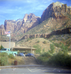 Vehicles parked in the parking lot of the old Mission 66 Visitor Center and Museum. ; ZION Museum and Archives Image 004.01.02-1of12 ; ZION 15933
