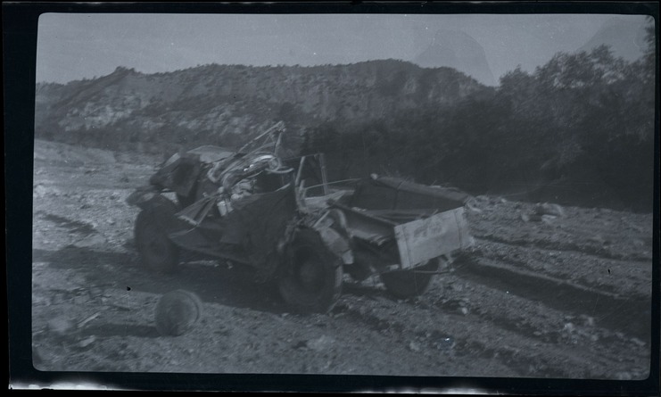 Nitrate negative motor vehicle accident on dirt road. Truck totaled. Location unknown. ; BRCA Museum and Archives Image BRCA8875_001_167 ; BRCA 8875
