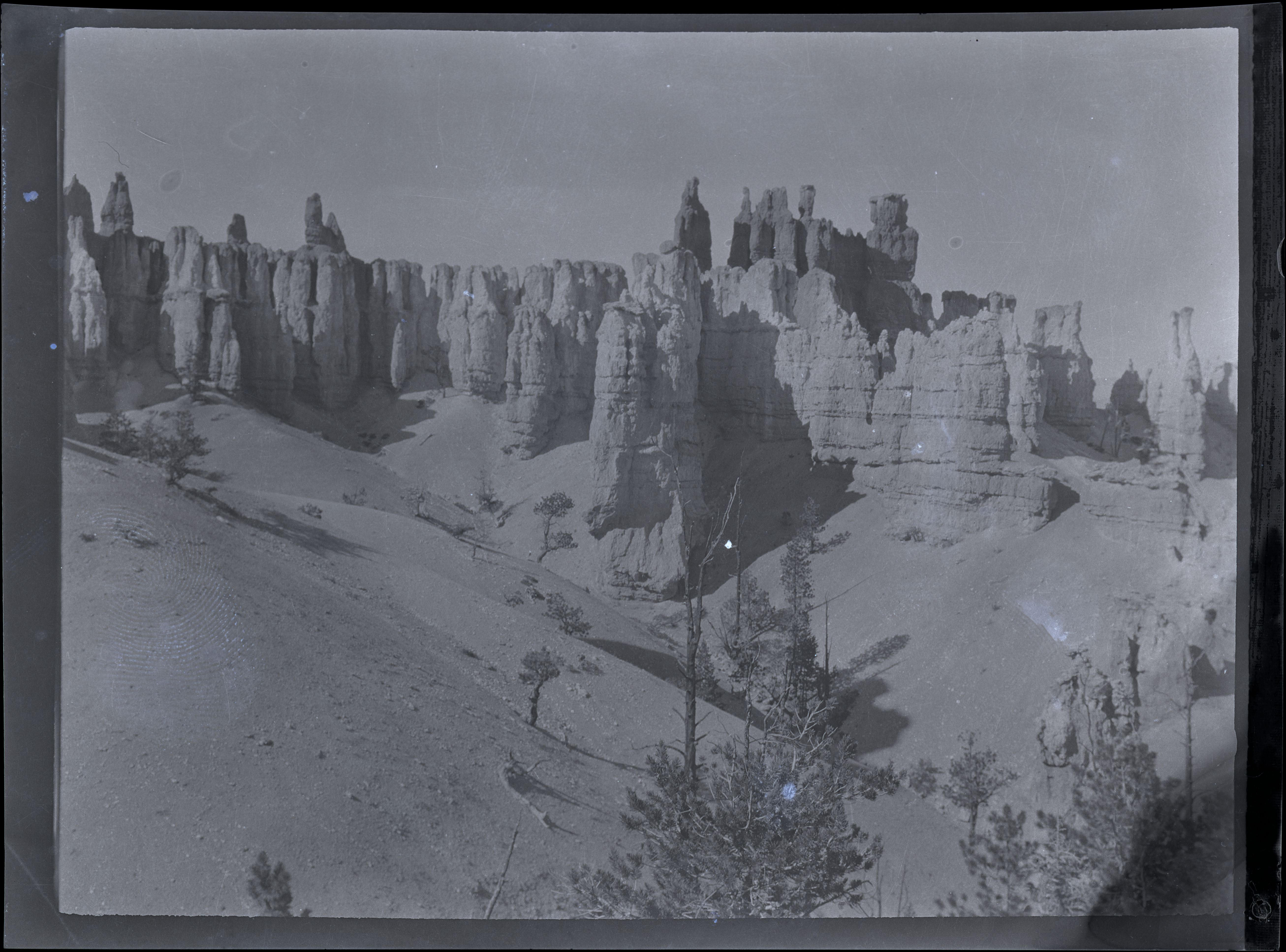 Nitrate negative of hoodoos from below the rim in BRCA. Sparse vegetation in foreground. ; BRCA Museum and Archives Image BRCA8875_001_317 ; BRCA 8875