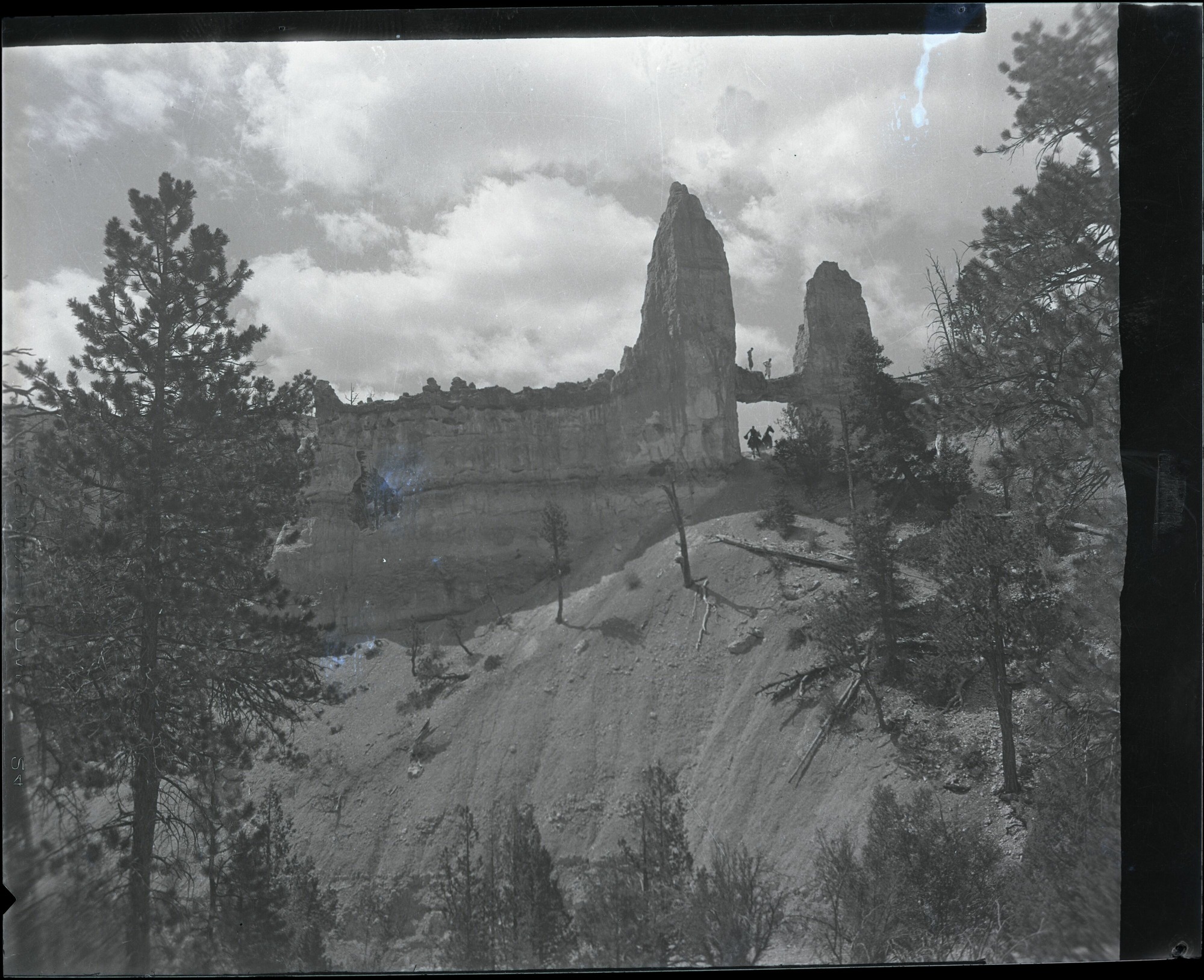 Nitrate negative two men standing on Tower Bridge with two horses below in BRCA. One horse had a rider and the other had someone walking alongside. ; BRCA Museum and Archives Image BRCA8875_001_235 ; BRCA 8875