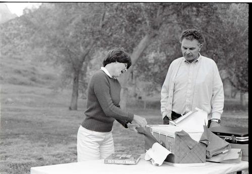 BW Photos of the Crocker/ Nicholson retirement barbeque. Superintendent Harold Grafe in apron at grill with man and woman. ; ZION Museum and Archives Image 800_04_01001 ; ZION 15933