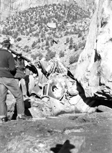 Rock slide damages of November 23, 1947, Oak Creek utility yard (maintenance area) an 880-ton boulder comes to rest on auto car. ; ZION Museum and Archives Image Zion 10340 107.06 Neg2196 ; ZION 15933