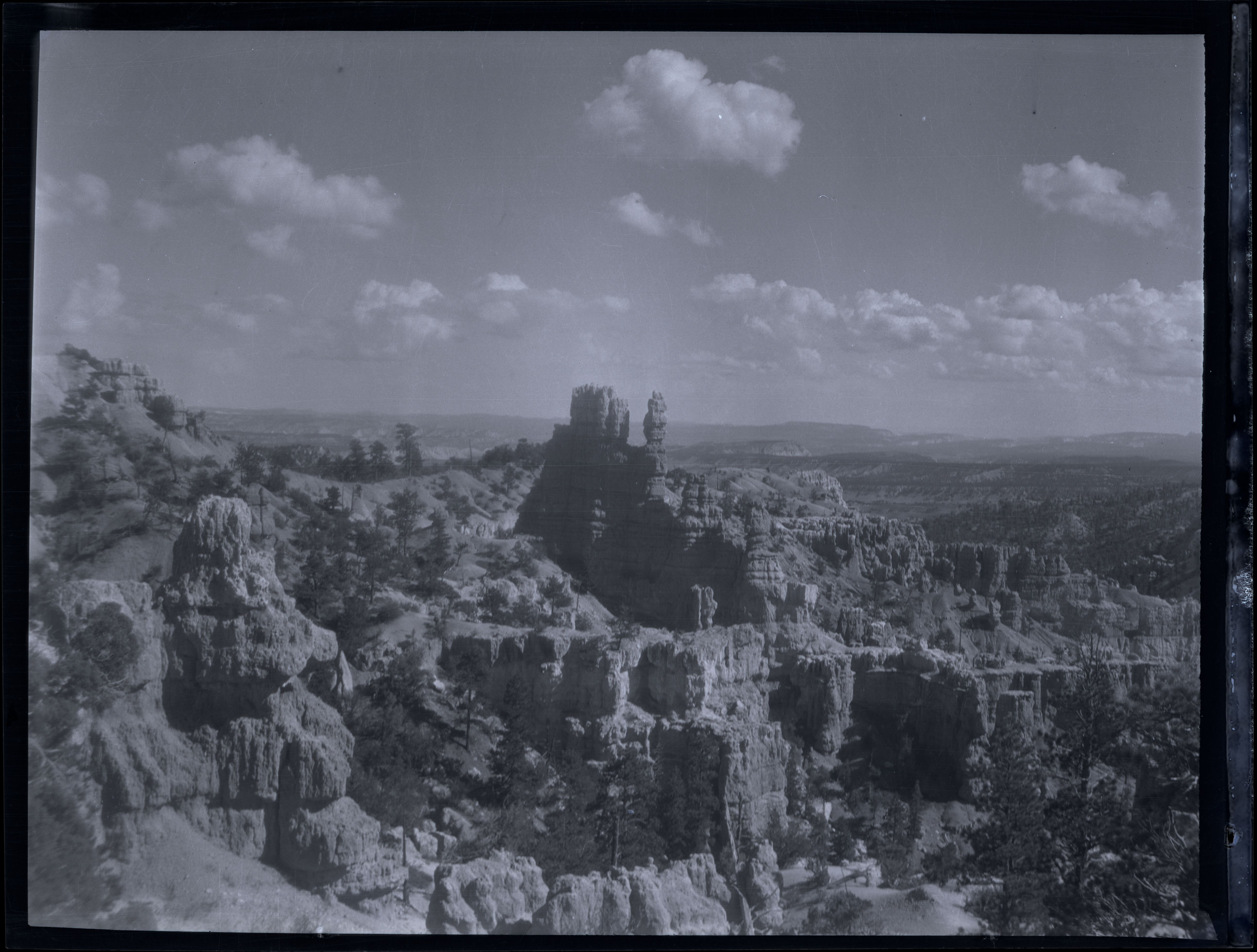 Nitrate negative of hoodoos and trees from below the rim in BRCA. ; BRCA Museum and Archives Image BRCA8875_001_117 ; BRCA 8875