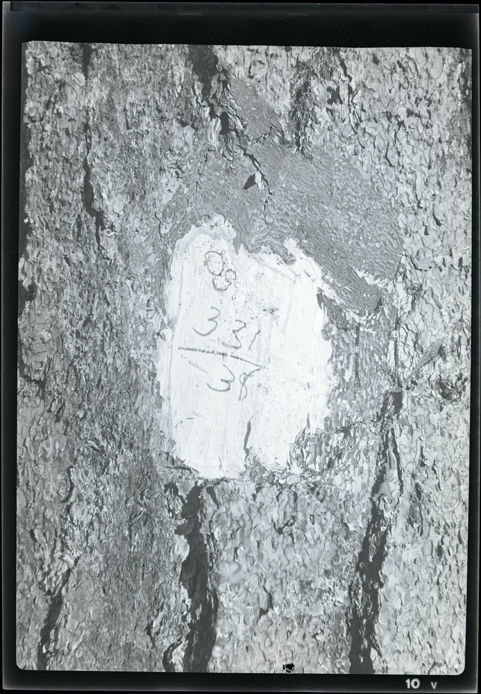 Nitrate negative of numbers possibly used for surveying on light colored substance on tree bark. Location unknown. ; BRCA Museum and Archives Image BRCA8875_001_409 ; BRCA 8875