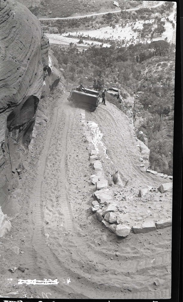 Completed paving of West Rim Trail near shelter cabin and the return of Lameraux's horses. ; ZION Museum and Archives Image 008_01_056 ; ZION 7634